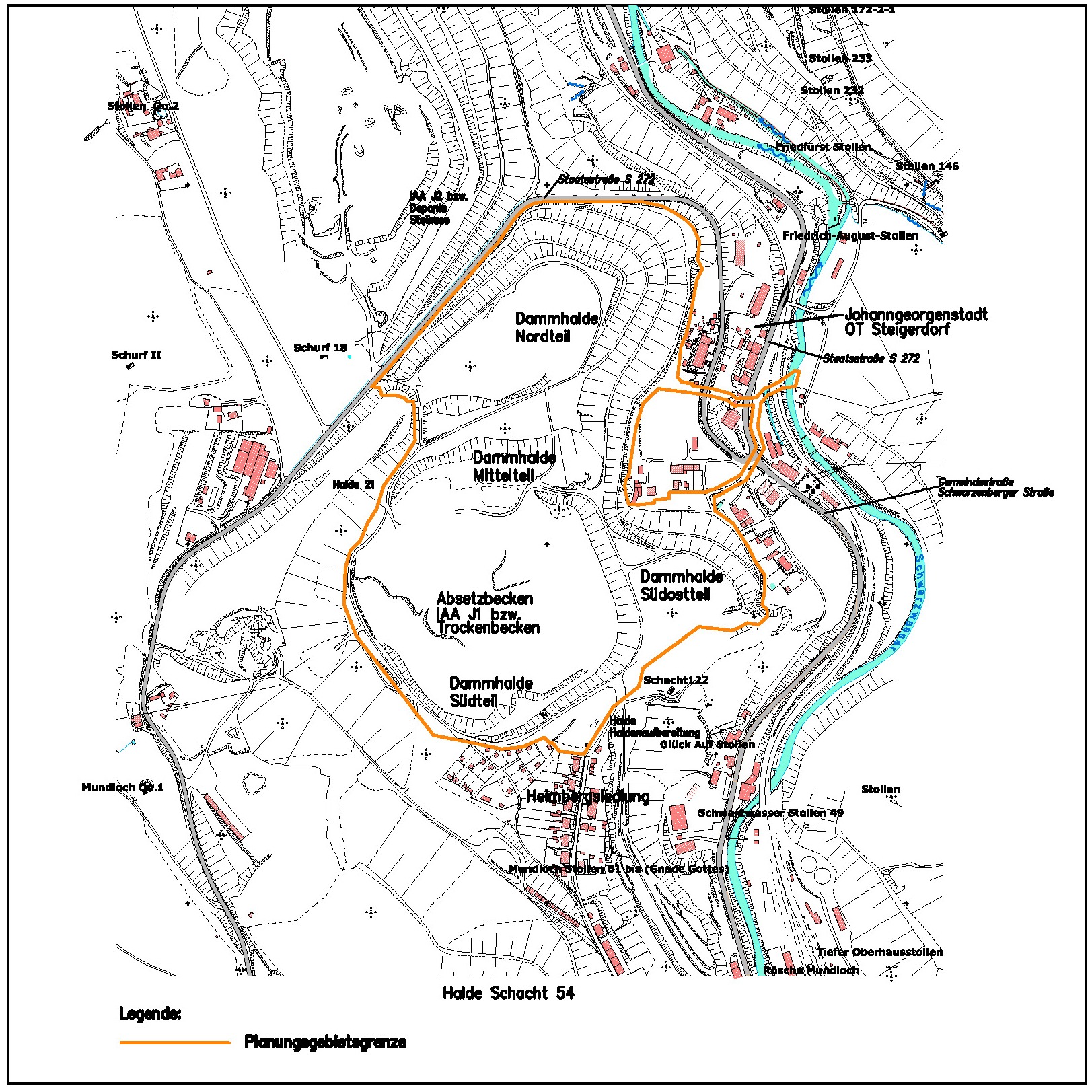 Das Sanierungsobjekt Dammhalde umfasst den Ortsteil Steigerdorf und die westlich davon befindlichen Halden- und Tailingsablagerungen der Dammhalde sowie der IAA J1 und beinhaltet eine Planungsgebietsgrenze von 29,2 ha. Der Abstand des Ostrandes des Haldenfußes zur Wohnbebauung der Wohnsiedlung Steigerdorf beträgt nur wenige Meter. Die eingespülten Tailingsmaterialien wurden in den 90er Jahren mit abgetragenen Haldenmassen überdeckt. Eine Reduktion der teilweise erheblichen Strahlenexposition für die Bevölkerung und die Beseitigung der festgestellten geotechnischen Instabilitäten ist erforderlich.
