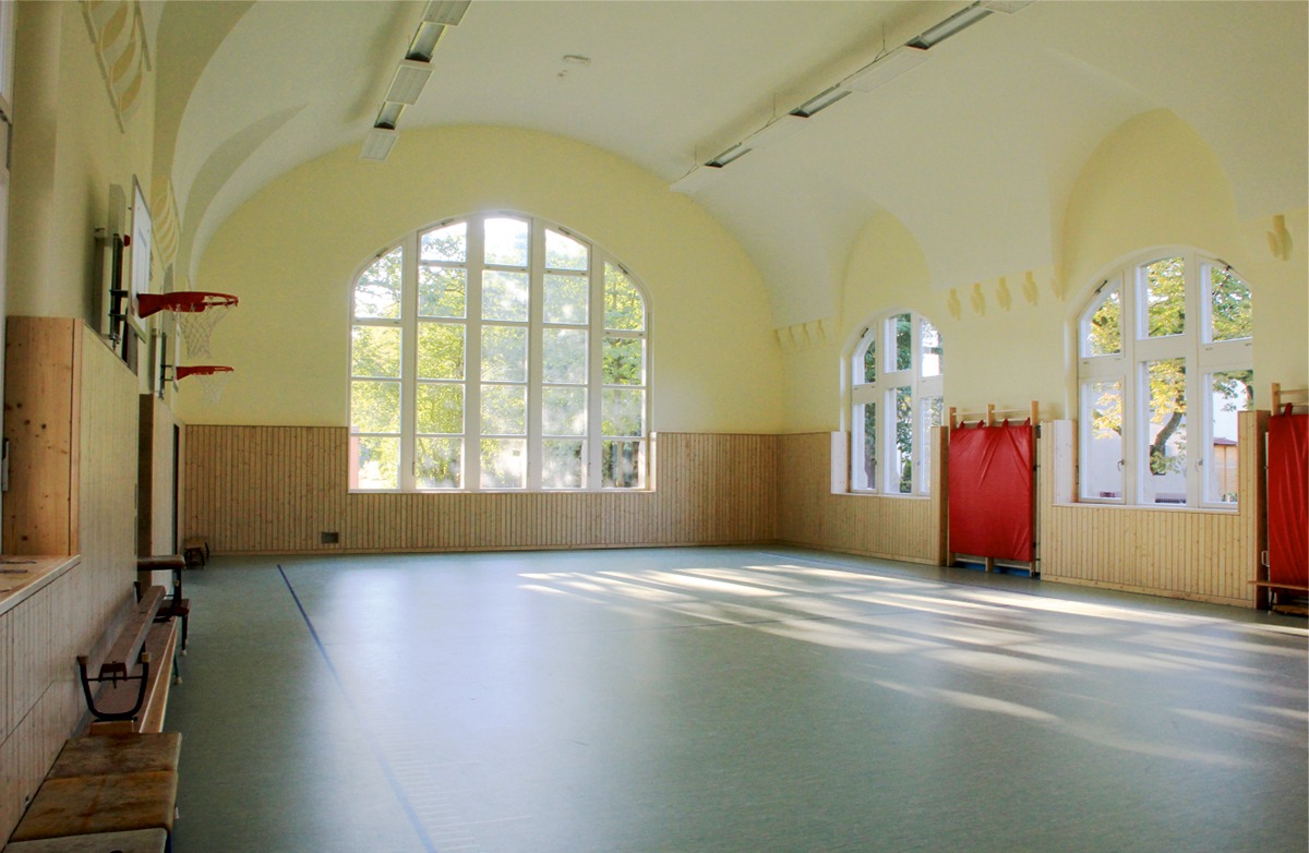 Die aus der Erbauungszeit der Schule im Jahre 1907 stammende Leimfarbenmalerei mit großflächigen Ornamenten im späten Jugendstil wurde bei einer Renovierung im Jahre 1980 durch eine Zwischendecke für mehr als 30 Jahre dem Anblick entzogen. Nach Entfernung dieser Zwischendecke im Rahmen der Gesamtsanierung des Schulgebäudes stellte sich die Bemalung als zwar seltenes Beispiel einer erhaltenen Leimfarbenmalerei aus dieser Zeit dar, war aber bei den verschiedenen Baumaßnahmen vielfach beschädigt worden.
