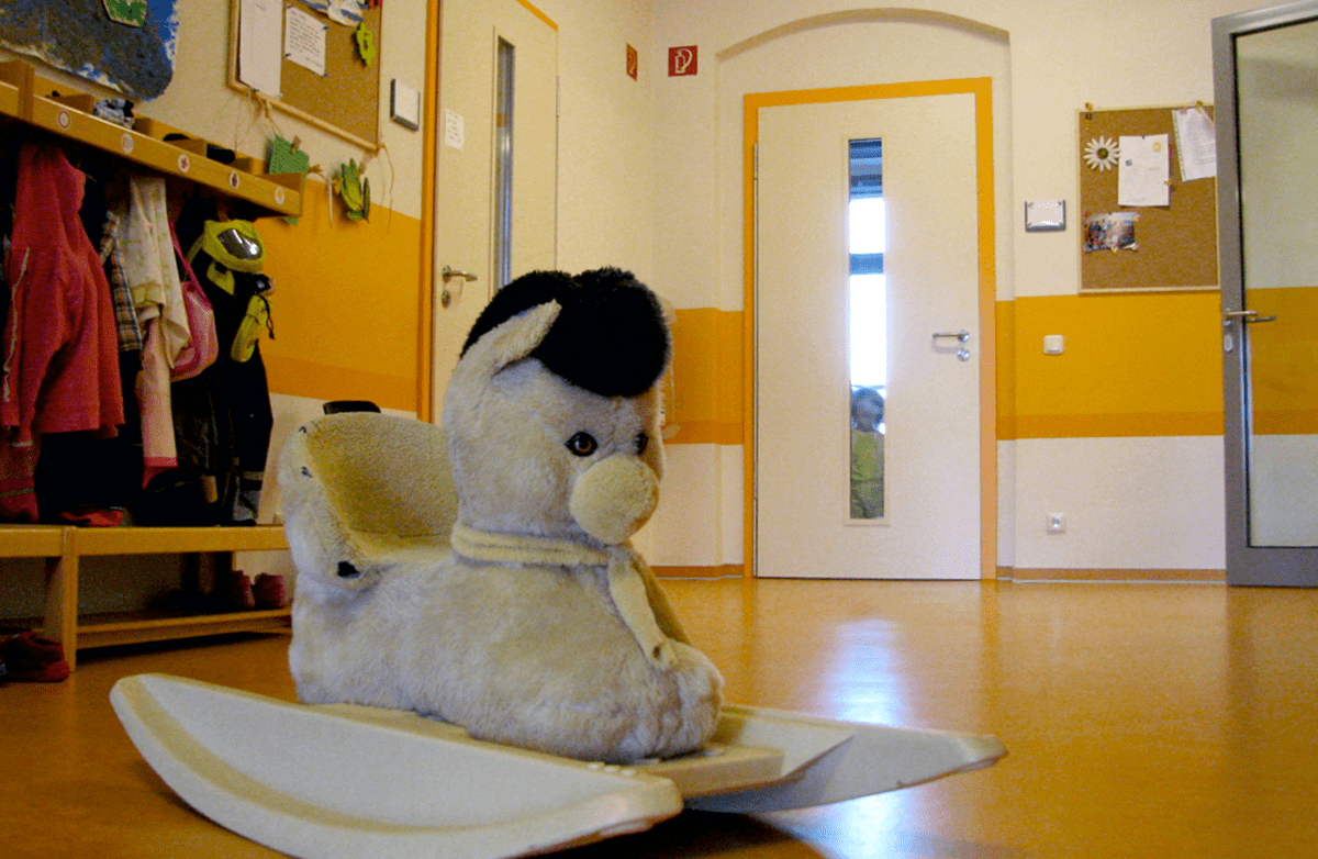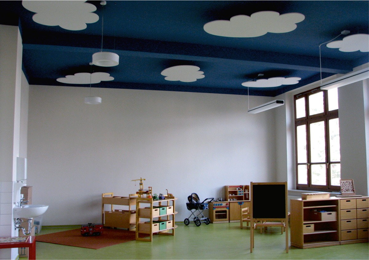 Der Neubau ordnet sich in seiner Kubatur und Fassadengestaltung in die Umgebung ein und präsentiert sich dennoch in eigener moderner Formsprache. Der Haupteingang ist in der großzügigen Glasfassade im Erdgeschoss der Kita eingeordnet und als solcher deutlich erkennbar. Dem nachfolgenden Foyer unmittelbar zugeordnet schließt sich der Krippenbereich, der Bereich der Kindergartenkinder sowie Multifunktionsräume der Kita an. Der Bereich der Kindergartenkinder ist ebenso wie der Krippenbereich komplett als eigenständige Nutzungseinheit im ehemaligen Schulgebäude untergebracht. Im Untergeschoss sind die gewünschte Kindersauna mit Umkleide- und Sanitärbereich, die Hausmeisterwerkstatt sowie weitere Neben- und Haustechnikräume der Kindertagesstätte untergebracht.