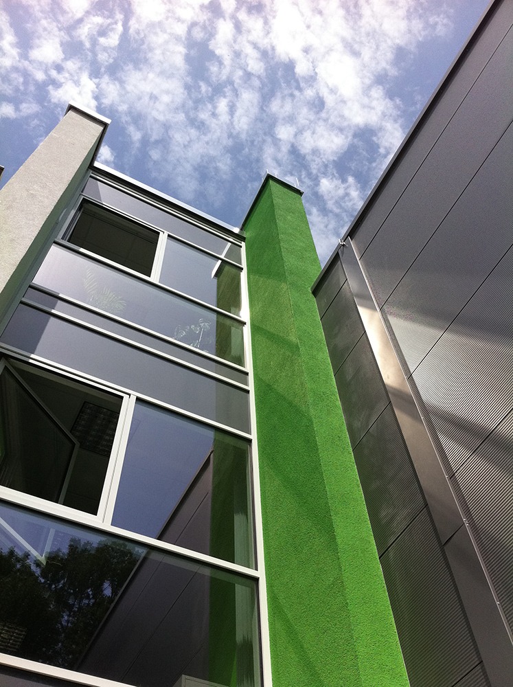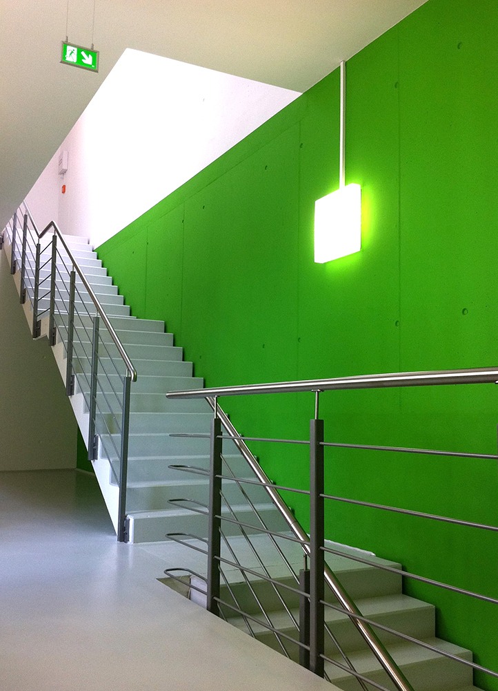 Die neuen Baukörper werden im Nordwesten des Betriebsgeländes im Bereich des ehemaligen Schulgebäudes angeordnet. Durch ein unterschiedliches Höhenniveau und variierende Proportionen werden die drei Bauteile zu einer Einheit gruppiert. Die prominenten Seiten des Gebäudes werden durch zwei Betonscheiben bestimmt, die das Gebäude nach außen präsentieren und eine Identität stiftenden modernen Charakter verleihen. In der Form und der Farbe geben Sie eine Visitenkarte für das Unternehmen nach außen gerichtet ab.