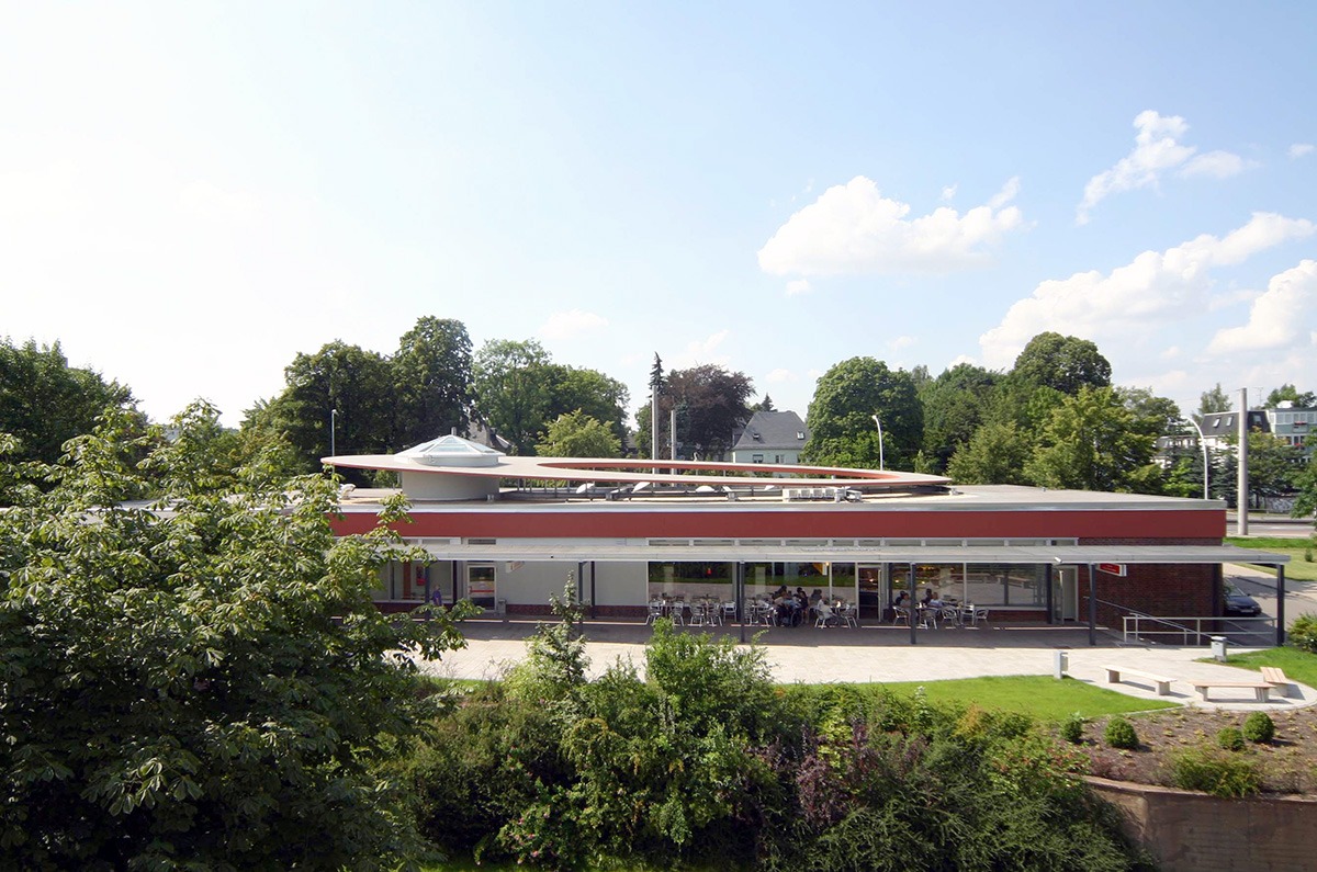 Die Umgestaltung eines ehemaligen Nahversorgungszentrums aus DDR-Zeiten war das Thema eines eingeladenen Architektenwettbewerbes durch die Stadtsparkasse Chemnitz. Unsere Architekten konnten diesen Wettbewerb mit der Idee einer Verbindung als Sparkassenfiliale, Handel und Gastronomie zur „Sparkassenpassage“ gewinnen. Darüber hinaus verliehen sie dem eingeschossigen Baukörper eine zusätzliche optische Ebene in Form einer „schwebenden Ellipse“ mit einem turmartigen Oberlicht über der Einkaufspassage. Das Gebäude bekam damit ein neues Aussehen, ohne seinen Grundcharakter zu verleugnen.