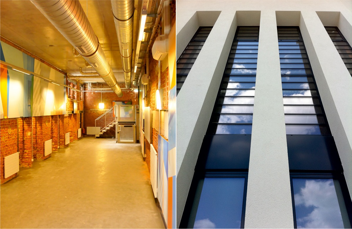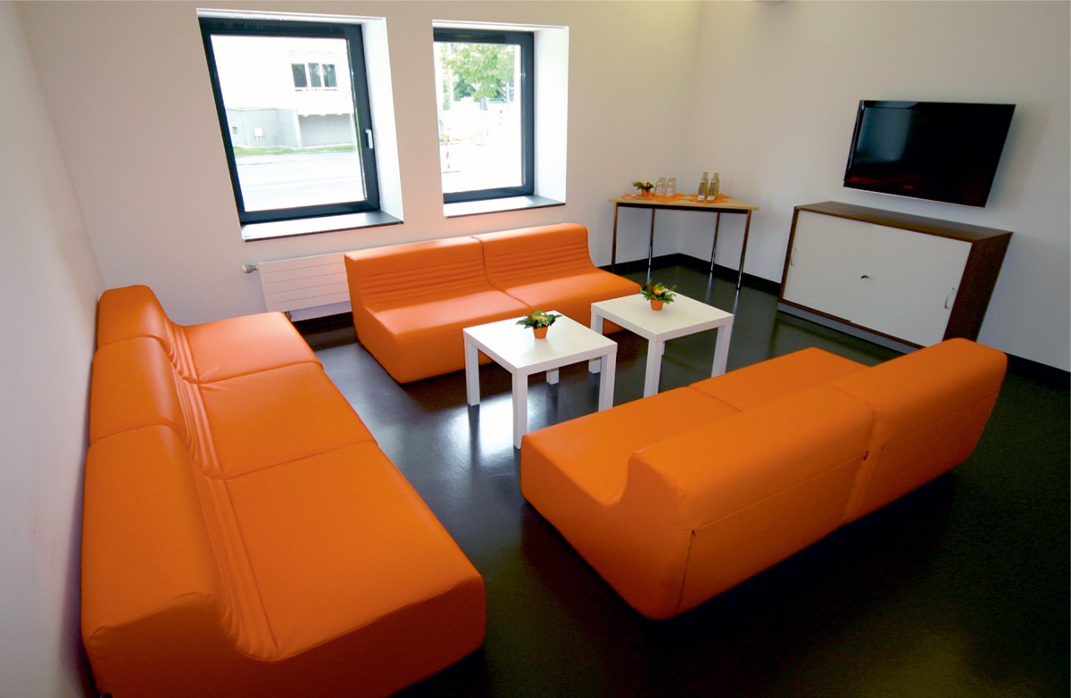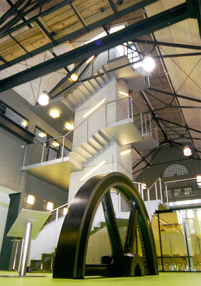 Das Hauptelement des Umbaus war die neue Erschließungsskulptur, welche den Weg vom Getreidemarkt über das neue Foyer in die Vertikale führt. Auf diese Weise wurden die zukünftigen Unterkunftsräume der Jugendherberge erschlossen. Die leichte Stahl-Skulptur wickelt sich dabei um zwei massive Betonkerne welche einen Aufzug und eine Hebebühne im Außenbereich für die barrierefreie Erschließung der Jugendherberge enthalten. Um bis in das 3. Obergeschoss zu gelangen, stößt der neue Treppenturm durch die Dachhaut der ehemaligen Werkshalle und findet seinen oberen Abschluss in einer leichten Aluminium-Glaskonstruktion, welche von einer auskragenden massiven Decke abgehangen wird. Die Materialität unterstützt das Gesamtkonzept. Mit einer leichten Stahlrampe und Treppe wird eine reduzierte Aussage getroffen und der Urbau betont.
